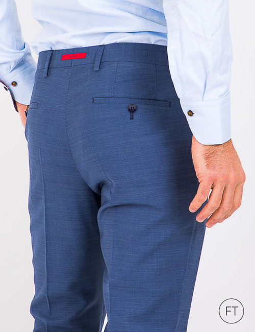 Deze slim fit broek in bright blue is vervaardigd uit Primatist Super 100's wol van Marlane, een luxueuze en ademende stof met een soepele structuur. De broek heeft een strakke, moderne snit zonder bandplooien en zonder omslag, wat zorgt voor een gestroomlijnde uitstraling. Dankzij de natuurlijke stretch van de wol behoudt de broek zijn vorm en biedt hij ultiem comfort, perfect te combineren met de bijpassende kostuumvest voor een verfijnde look.