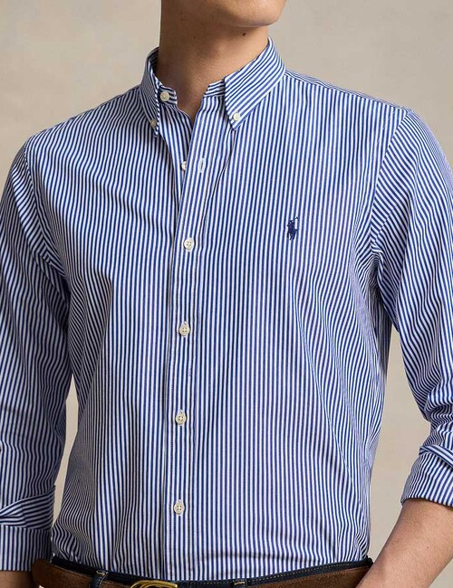Dit slim fit gestreepte stretch poplin overhemd biedt een moderne en verfijnde uitstraling, gecombineerd met comfort en functionaliteit.