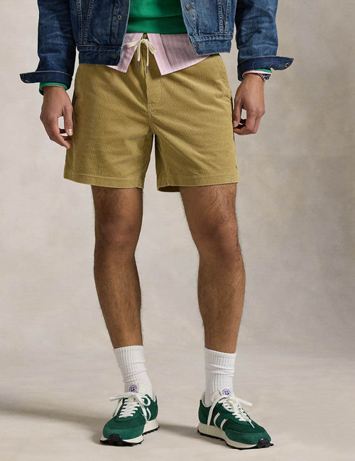 Deze beige corduroy short is een moderne update van een klassiek model. Gemaakt van zachte ribfluweel en voorzien van een comfortabele elastische tailleband met trekkoord. De 6-inch lengte en relaxte pasvorm zorgen voor een casual, vintage geïnspireerde look.